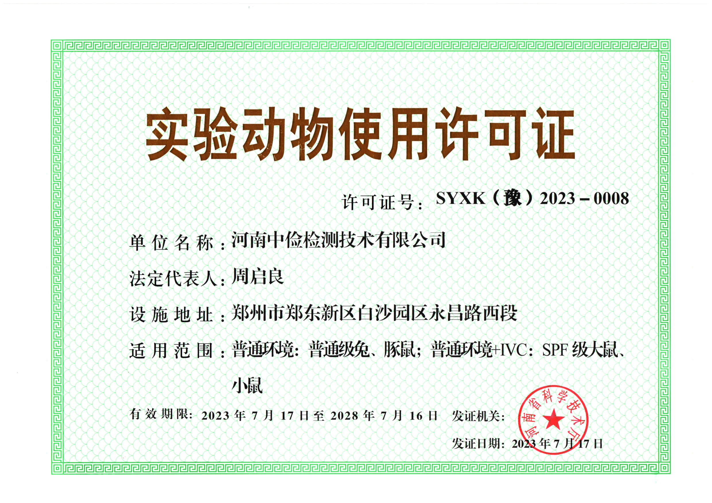 - 喜報(bào)!河南中儉檢測(cè)取得新的實(shí)驗(yàn)動(dòng)物使用許可證!